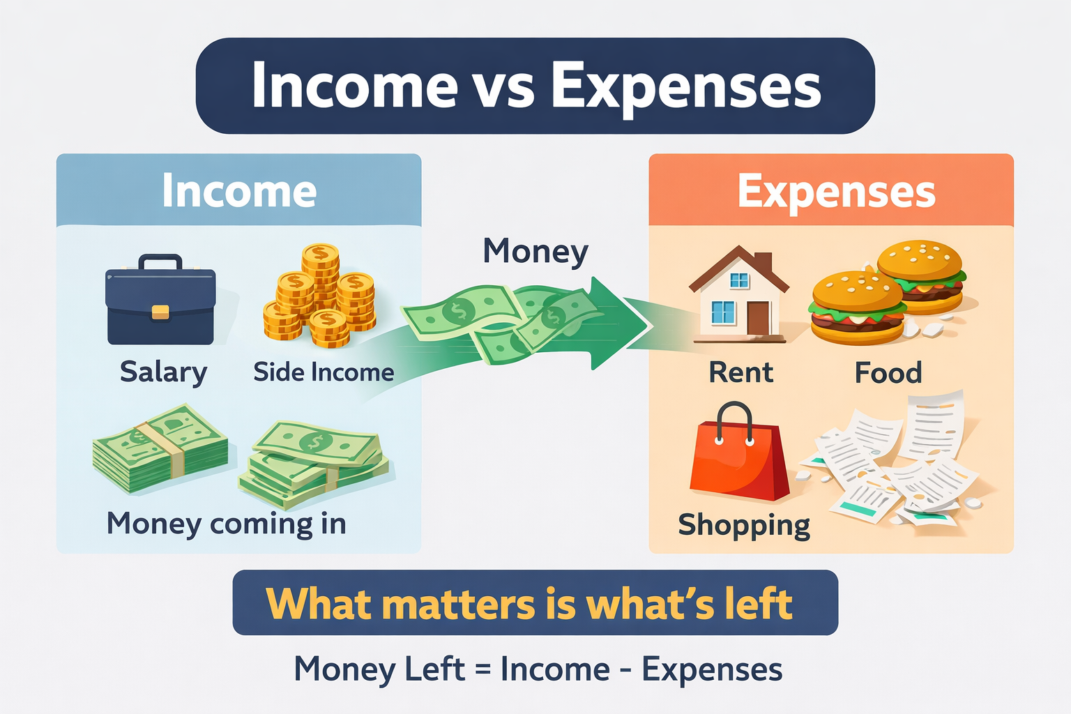 수입과 지출은 경제를 이해하는 가장 기초적인 개념입니다. 수입(income)은 월급, 사업소득, 용돈처럼 내 통장으로 들어오는 모든 돈을 의미합니다. 반대로 지출(expenditure)은 식비, 월세, 교통비, 쇼핑처럼 통장에서 빠져나가는 돈을 말합니다. 여기서 지출이란 소비자가 재화와 서비스를 구매하기 위해 지불하는 모든 금액을 뜻합니다.